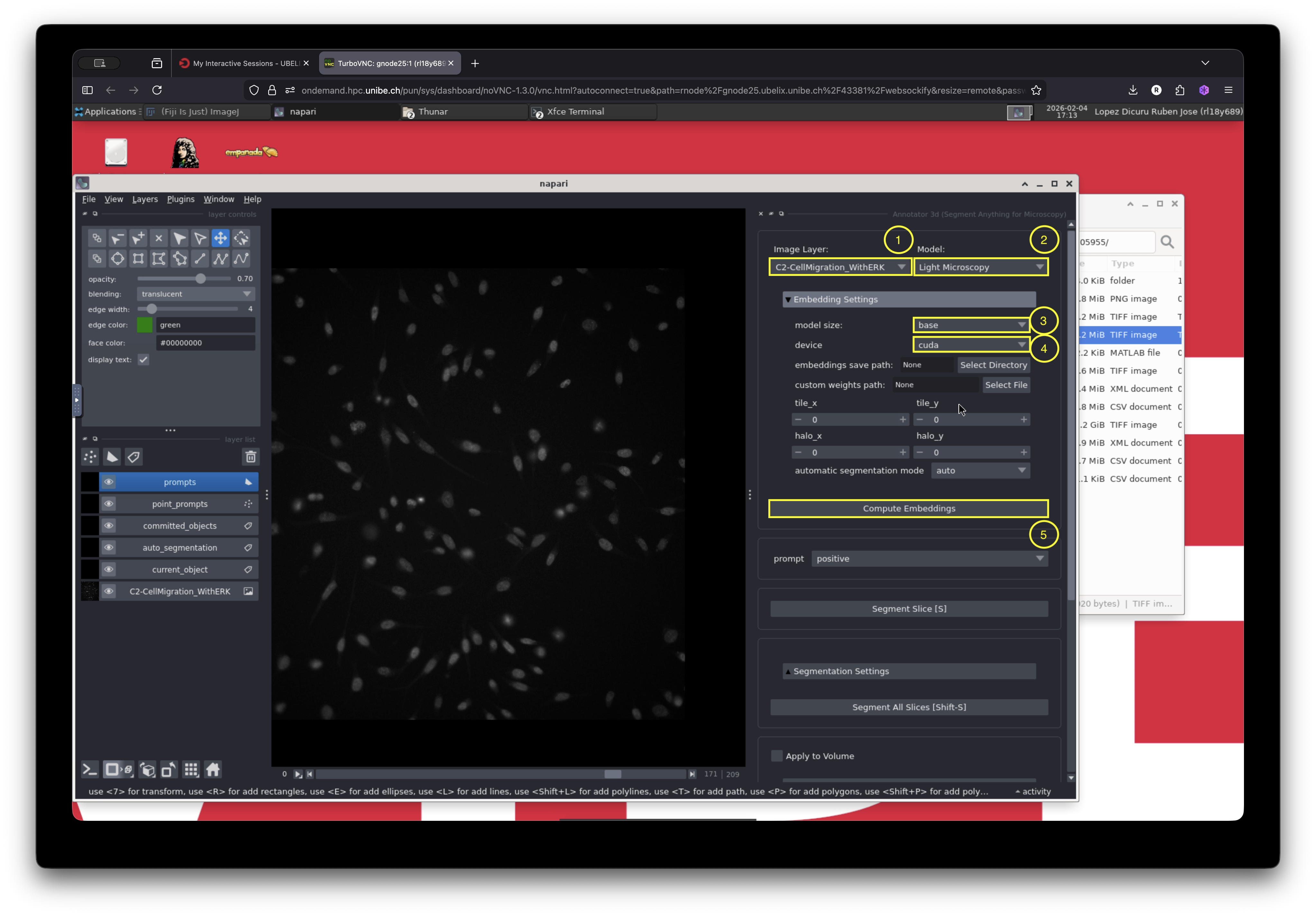 microSAM provides several parameters that can be adjusted for optimal segmentation. In addition, it must compute image embeddings before generating predictions.
