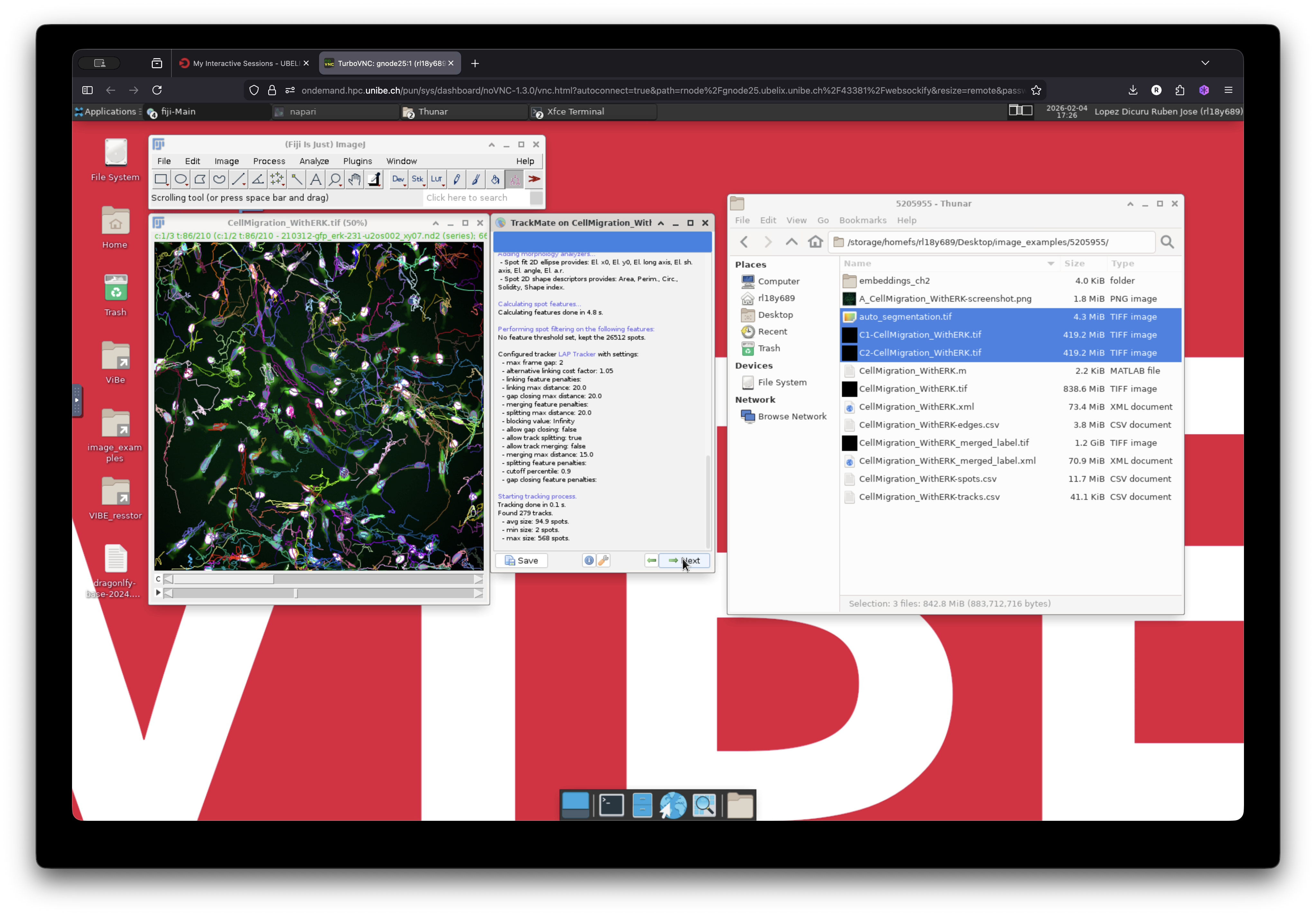 We use the DAPI staining channel as a reference for cell tracking. microSAM is used to segment the cell nuclei, and the resulting labeled nuclei are then used as input for tracking cell trajectories with TrackMate in Fiji. Between these steps, several preprocessing operations are performed, including splitting and merging image channels.